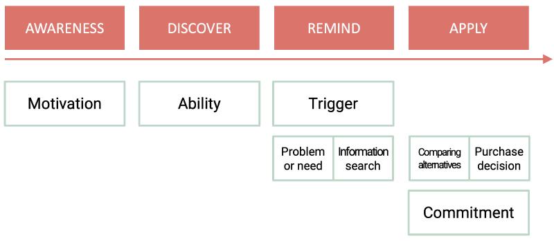 Om het aankoopgedrag van mensen te veranderen heb ik de tijdlijn opgesteld met vier stappen: awareness, discover, remind en apply. Deze tijdlijn is gebasseerd op Fogg's behavioural model. Dit model laat zien om gedrag te veranderen moeten motivation, ability en de trigger op hetzelfde moment aanwezig zijn.