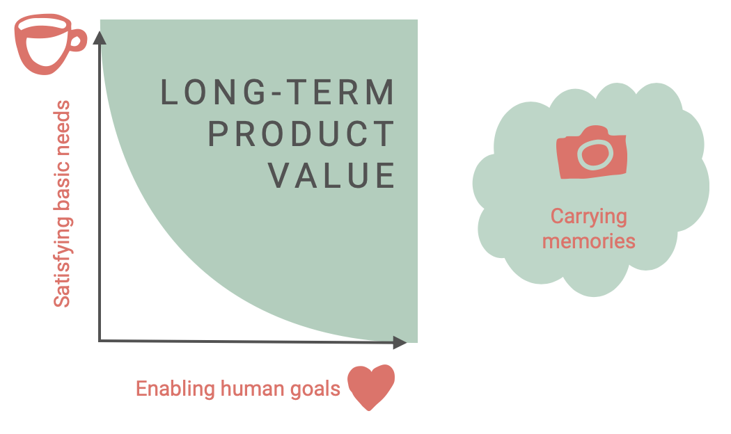 Door onderzoek te doen via interviews heb ik het lange termijn waarde voor producten model opgesteld. Het bestaat uit drie componenten: basisbehoefte, menselijke doelen en herinneringen.