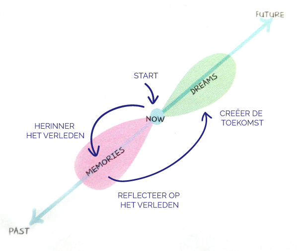 Mensen vinden het moeilijk om de toekomst te bedenken. Daarom is het belangrijk eerst het heden in beeld te brengen. Vervolgens kan je het verleden en herinneren en erop reflecteren. Al deze denkstappen maken het makkelijker om je wensen voor de toekomst te uiten.