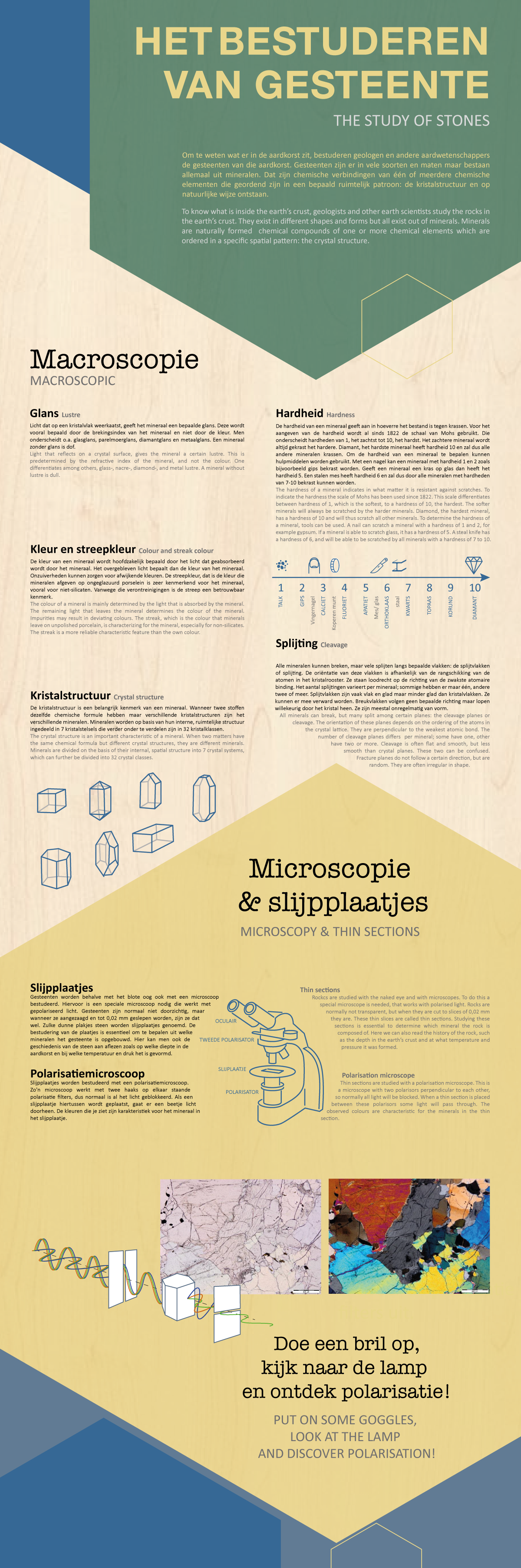 Voor de polarisatiedemo heb ik een kast ontworpen met de microscoop en een scherm. Daarvoor staan krukjes in een collegezaal opstelling waar de anderen aanwezigen mee kunnen kijken. In de krukjes is er ruimte vor de VR bril die als hij niet wordt gebruikt daar wordt opgeladen. Met de VR bril gaat de bezoeker eerst de mijn in om te kijken waar al het gesteente vandaan komt. Vervolgens krijgen ze informatie over de mijnbouwkunde faculteit in Delft en mogen ze zelf slijpplaatjes onder de microscoop leggen en bekijken.