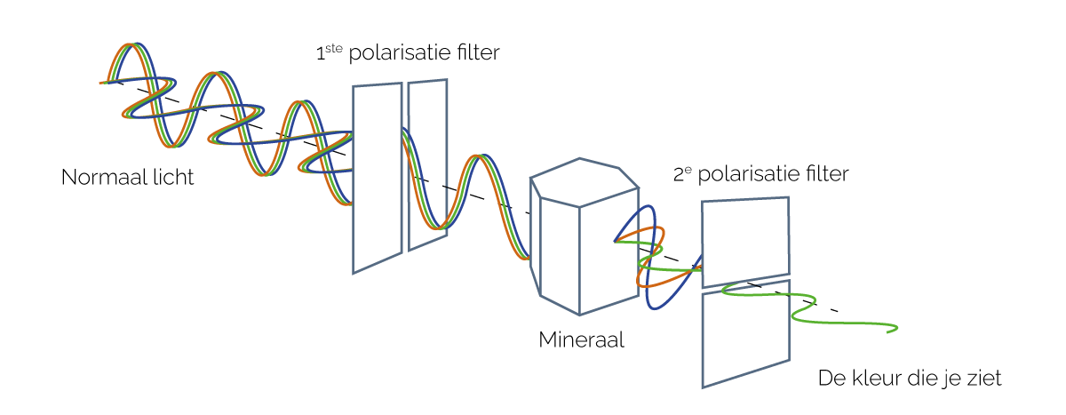 In de polarisatiemicroscoop kan je met behulp van prachtige kleuren bepalen om welk soort gesteente het gaat. Dit komt doordat het gepolariseerde licht verdraait in het slijpplaatje. Het slijpplaatje is een heel dun laagje steen, waardoor het licht heen kan schijnen en verschillende kristalstructuren goed zichtbaar maakt door de verschillende kleuren.
